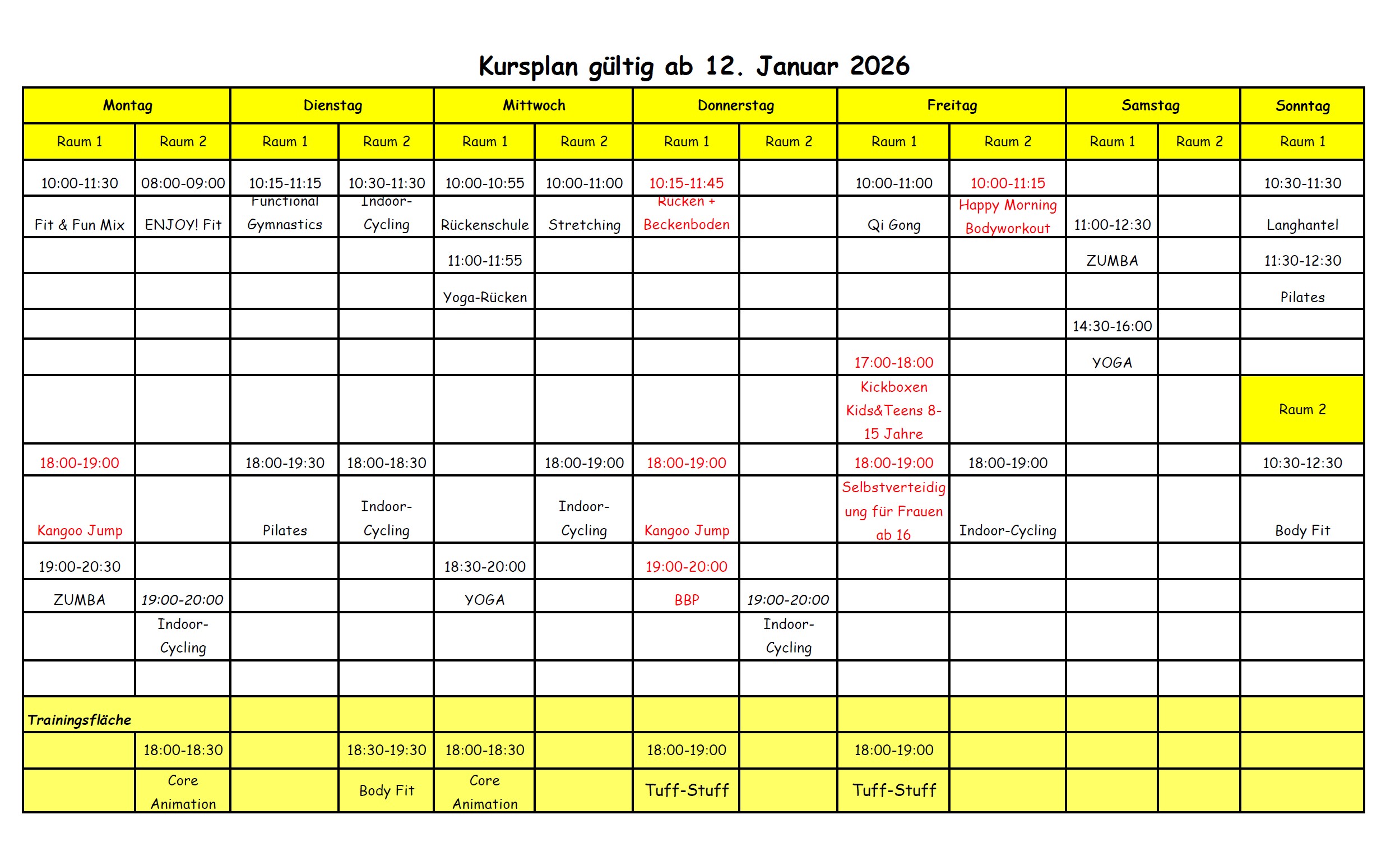 Der Kursplan ist gültig ab 12. Januar 2026